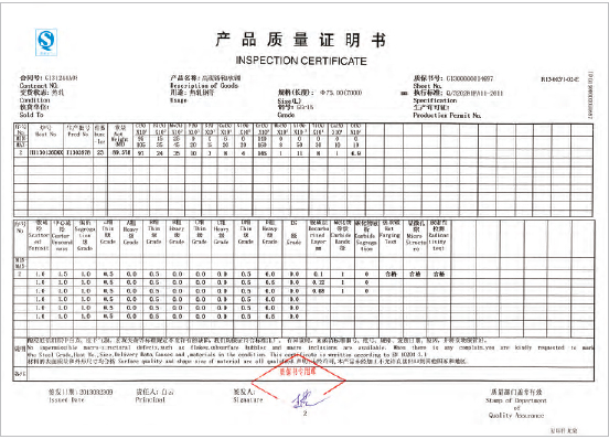 Following is a example of the inspection certificate for YBN bearing material. It meets all the requirement of Germany, Japan and USA standard.